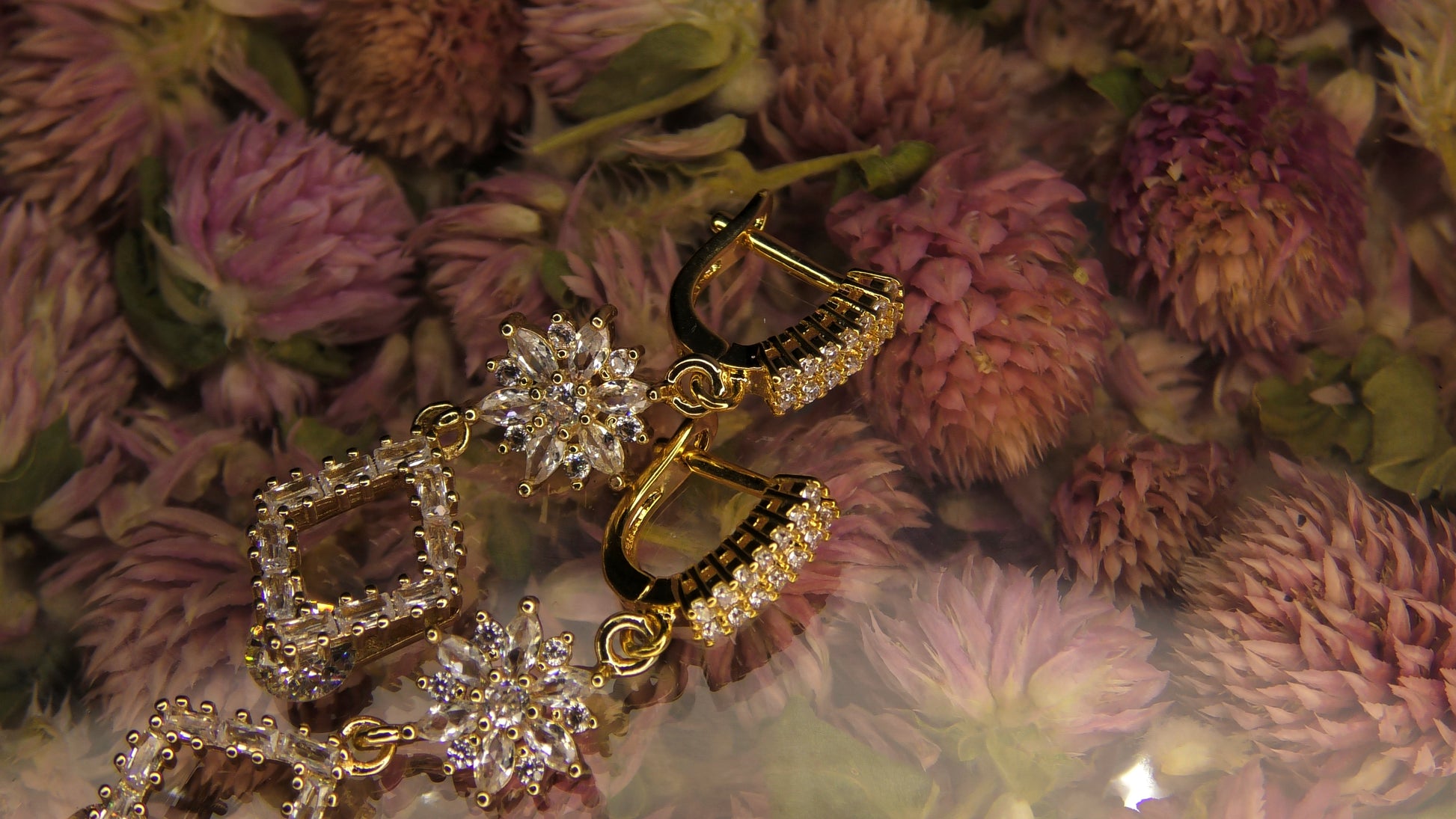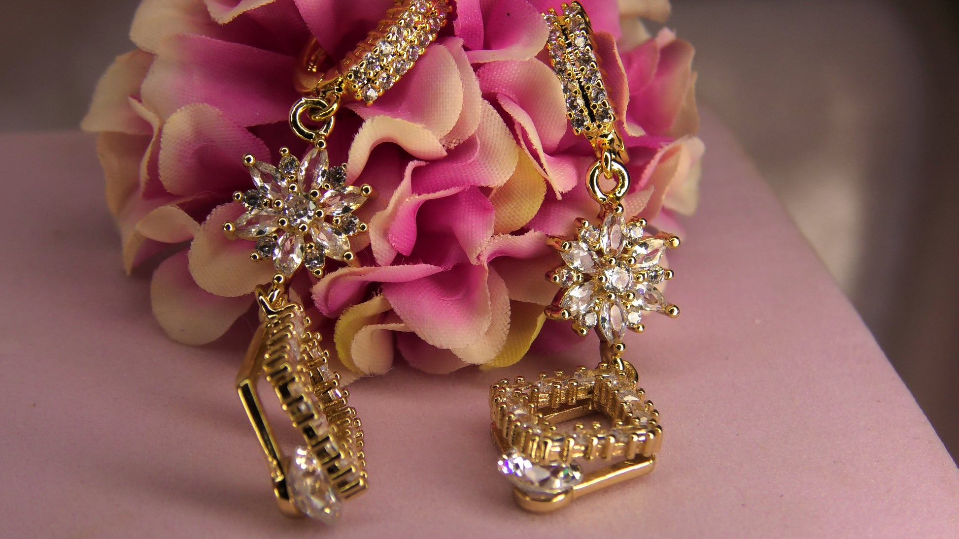 Elegant Guldpläterade Kopparörhängen med Diamant och Glittrande Cubic Zirconia Blommönster