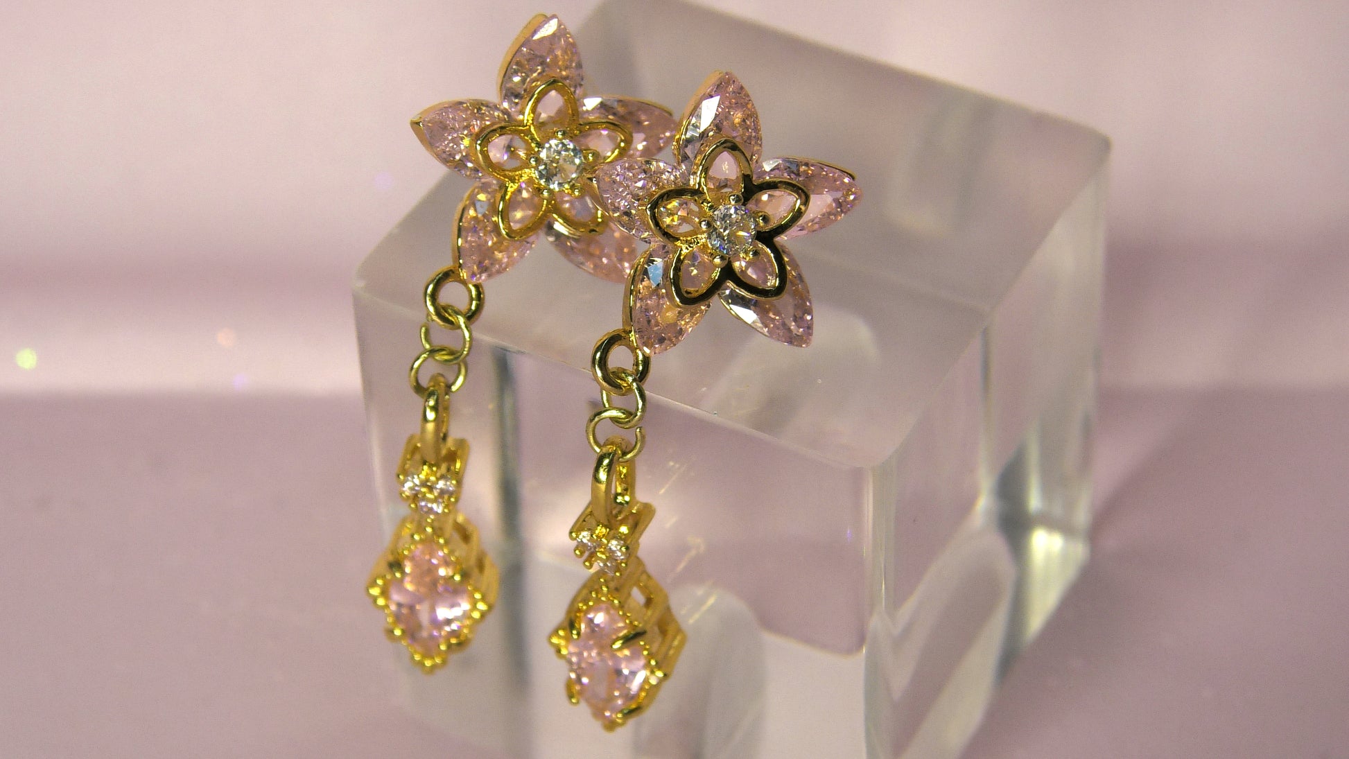 Kombinationen av de mjuka rosa blommorna och de glittrande zirconia-stenarna skapar en bländande effekt, vilket gör dem perfekta för att addera en färgklick till din outfit samtidigt som de behåller en sofistikerad känsla. Oavsett om du klär upp dig för ett speciellt event eller ger din vardagsstil en feminin touch, kommer dessa örhängen garanterat att imponera.